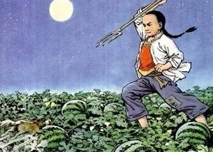 [《少年闰土》节选]深蓝的天空中挂着一轮金黄的圆月,下面是海边的沙地,都种着一望无际的碧绿的西瓜。其间有一个十一二岁的少年,项带银圈,手捏一柄钢叉,向一匹猹尽力地刺去。那猹却将身一扭,反从他的胯下逃走了。