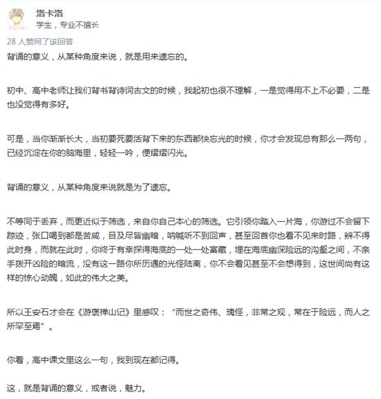 所以,“背诵全文”,不仅仅是背那一个个的字,更是要吃透文章内涵。《离骚》的悲壮、《阿房宫赋》的壮美、《长恨歌》的哀婉……正如上面那位网友所说,世间尚有“如此的伟大之美”。吃透了,你就可以流利又富有感情地诵出来,中华文化骨子里的东西也会在你脑海中、在你心中沉淀下来。