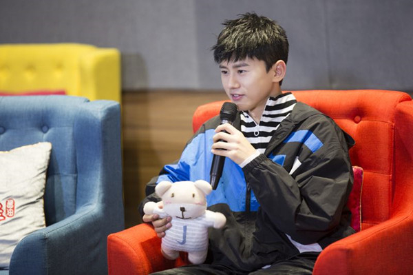 张杰接受采访时不忘展示妻子谢娜制作的小熊。