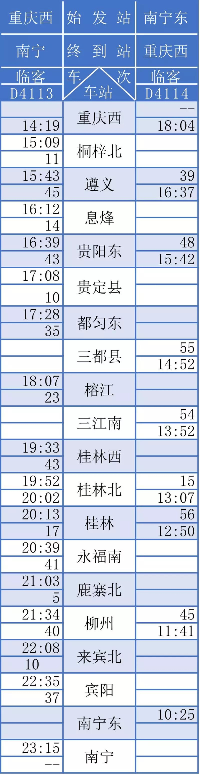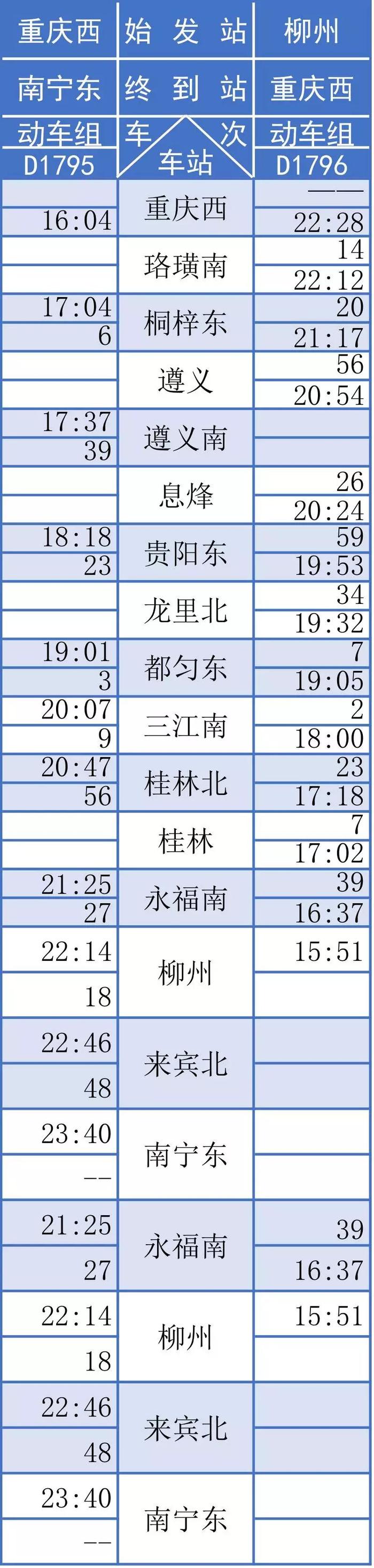 以下车次票价及开行时间未定,一有消息我们会第一时间发布;更多广西至成都、重庆动车组车次时刻信息请以12306铁路客户服务中心网站和车站公告为准。
