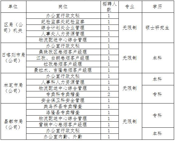 中国烟草总公司西藏自治区公司,因事业发展需要,现定向招聘全日制专科及以上学历毕业生22名,相关事宜公告如下: