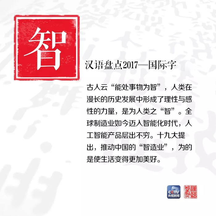 “智”和“人类命运共同体”则当选国际字词。主办方阐释为,人类将自身的智慧注入机器,全球制造业开始迈入智能化时代,人工智能产品不断推出。可以想见在不久的未来,人类的生活将变得更加“智慧”。