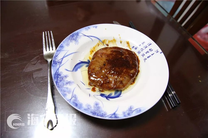 第一块牛排煎熟了,鄢张雅在牛排表面撒上孜然粉,倒上牛肉酱,然后用锅铲把酱料在表面抹匀,盖上锅盖焖了一会儿之后,她把牛排铲出锅,双手拗起锅子,把油倒在牛排表面。