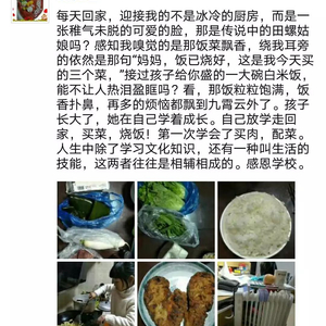 “看,那饭粒粒饱满,饭香扑鼻,再多的烦恼都飘到九霄云外了。孩子长大了,她在自己学习成长。自己放学回家,买菜,烧饭!第一次学会买肉,配菜,人生中除了学习文化知识,还有一种叫生活的技能。这两者往往是相辅相成的。感恩学校。”