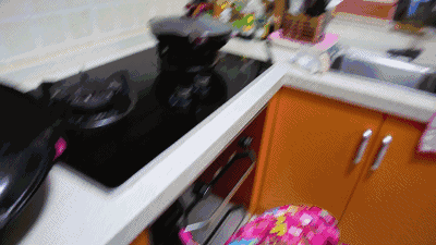 之后,她用两只手拗起大铁锅放在一边,在煤气灶上放上平底锅,站在厨房的小木凳上,拿起放在角落的油壶,往里面倒油。