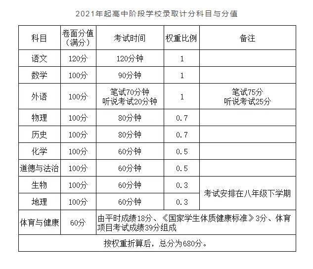 其中,语文满分为120分,数学满分为100分,外语满分为100分,物理、化学、道德与法治、历史、生物、地理科目卷面考试分值均为100分,按不同权重比例计入录取总分。体育与健康满分为60分。