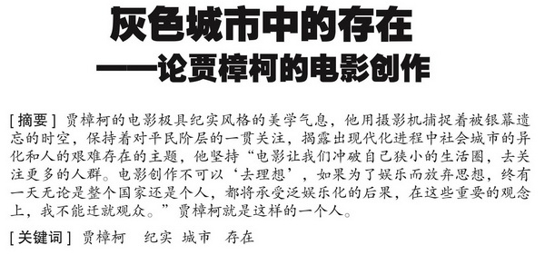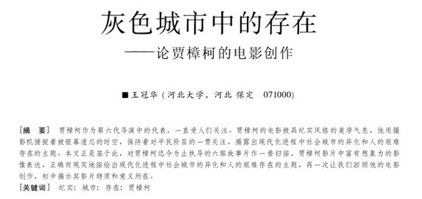 王冠华论文的导语是:贾樟柯作为第六代导演中的代表,一直是人们关注的重点。据第 30届夏威夷国际电影节组委会公布,在于2011年10月14日~24日举行的电影节上,除了张艺谋导演的《山楂树之恋》获选为开幕影片外,中国著名导演贾樟柯当选为本届电影节 “焦点影人”,电影节除将举行贾樟柯最新作品《海上传奇》的美国首映看点式以外,还设立“向贾樟柯致敬”单元,放映贾樟柯的成名作《小武》和短片代表作《河上的爱情》,以向贾樟柯近十年来杰出的艺术成就致敬。贾樟柯影片中富有想象力的影像表达,正确而现实地描绘现代化进程中社会城市的异化和人的艰难存在的主题,再一次让我们回顾他的电影创作。