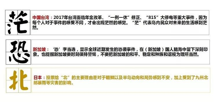 2017:全球的年度汉字有“恐”,有“茫”,有“创”,还有……如果你热衷读新闻,可能会发现整个12月份,每隔三两天,就有一则年度汉字的新闻跳出。据统计,全球共有7个国家、地区每年发布年度汉字,加上一个只发布年度成语的韩国,总共8个国家、地区会用汉语来总结一年的世态。