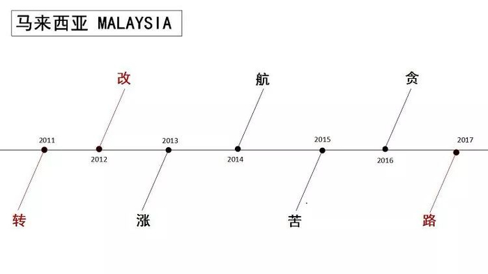 马来西亚:连续4年负面,2017终于找到“路”马来西亚于2011年开始举办年度汉字评选,距今为止已选出了7年的代表汉字。其中,从2013年的“涨”起,马来西亚的年度汉字开始了连续4年呈负面情感的状态。对马来西亚的民众来说,“涨”并不是一个令人高兴的字,因为它指代的不是股票、工资上涨,而是税收、物价上涨。2013年,马来西亚政府进行了政策性的物价上涨:削减燃油、白糖补贴,提高房地产税率、调高过路费用,马来西亚人民的生活、中小企业的发展因此受到了极大影响。后续三年:马航事件、国际石油价格上涨、马币贬值、国内官员特大贪腐案件让马来西亚社会持续处于辛苦与不满中。直至2017年,马来西亚才有机会缓了一口气,开始思考个人与国家的未来出路,而中国“一带一路”的倡议也为马来西亚,以及它的铁路、高铁、地铁等基础设施建设带来进展。