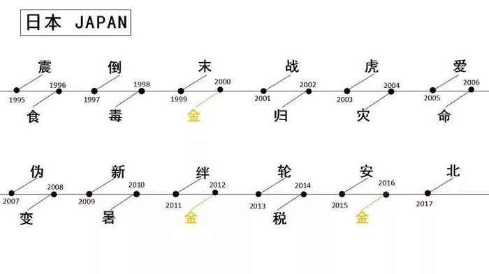 其次,抛开日本独爱的“金”字不谈,“乱”、“变”、“和”也是年度汉字的常客。