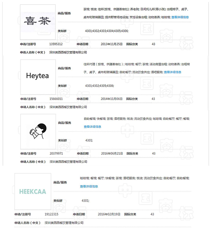 据介绍,“喜茶”商标权利人美西西公司拥有的注册商标主要有: