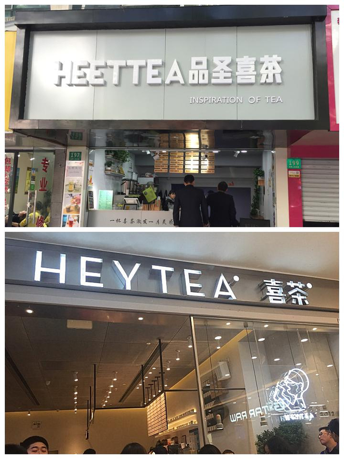 Heytea变成了HEETEA一、在店铺门头上抄袭使用与“喜茶”中文商标相同、与“Heytea”英文商标近似的组合标识,比如“HEETEA喜茶”。