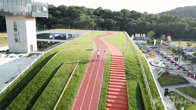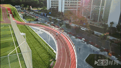 顺着钢琴一样的台阶爬上坡,就能看到这条特别的跑道,全长760米,全部采用塑胶铺成。为了保证跑步的脚感,建筑师特别从几种备选的塑胶材料当中,选择了比较软的那一种,塑胶部分一共有三种颜色,分别是红色、绿色和橙色。红色部分是跑道,绿色、橙色属于慢行道,可以有效地减少相互干扰,整条跑道和以往见过的,任何一条操场跑道都不一样。