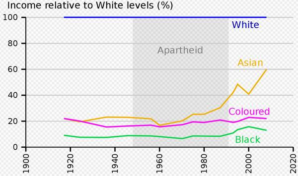 这或许就是彼时的南非被现在一些人吹嘘成“发达国家”的原因。可这只是一个幻象,建立在“黑人不算人”基础之上的幻象。假如以按照欧洲居民人口来计算国民收入水平,南非确实可以列入发达国家。但在劳动力市场的种族隔离制度下,南非全国99%的工程师、78%的自然科学家、91%的技术人员、72%的技工都由白人充任;其结果是,要是按非洲居民人口来计算的话,南非的国民收入水平则属于最落后国家之列。1983年,亚裔(主要是印度人,日本人算“荣誉白人”)人均可支配收入只有南非白人的37%,有色人种是26%,居住在城镇内的黑人是22%,居住乡村的黑人更是令人难以置信的只有6%!生活在南非当局圈定的“黑人家园”中的黑人有三分之二的人口生活在赤贫中。这就导致种族隔离的南非成为世界上贫富差距最大的国家。上世纪七十年代初,南非最富有的20%的人拥有该国财富的75%(美国是不到40%);南非的基尼系数竟高达0.61——而这个系数在0.40以上已经意味着贫富严重不均了。