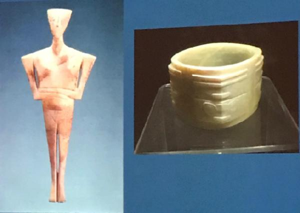基克拉迪交叉双臂的形象,应该是代表基克拉迪的民族,但是这个时候我们也不好说民族,因为这个时期民族还不能被定义,那么至少可以说它是一种自我承认、自我尊重的象征。它们是两种文化的象征和标志,交叉双臂的形象影响了现代艺术,是后来希腊文化的滥觞,玉琮可能20年前还认为是酋帮社会的产物,现在基于详细的考古发掘工作,我们了解到良渚有城,有高台,有水利系统,它应该已经进入到了国家社会,它是可以跟埃及和苏美尔的国家社会相媲美的。