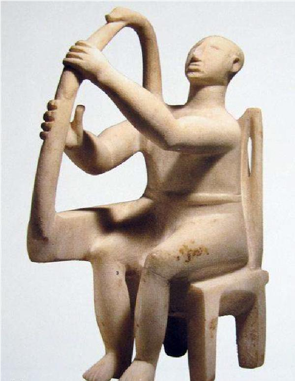 出自于希腊半岛部分的金器“酱碟”,其实应该是一种饮酒的用具,很有可能是用来喝葡萄酒的,希腊的经济作物主要是橄榄和葡萄。这个时候的航海技术也很发达,陶器上面刻有船的纹饰,这些都体现了技能熟练的人,包括冶金的人、做贸易的人之间有长距离的交流,可以说很有文明的气象。同时还有一些非常精美的艺术品,比如弹箜篌的人,其实物件只有20厘米高,可能是保存最早的关于音乐器材的文物。出自克罗斯岛同一个墓的还有吹双管笛的人。它们好像也作为礼仪用途,最大的一件有1米7这么高,这也是迄今为止知道的世界上最早的真人大小的造像之一,其他可以比拟的就是在埃及发现的了。