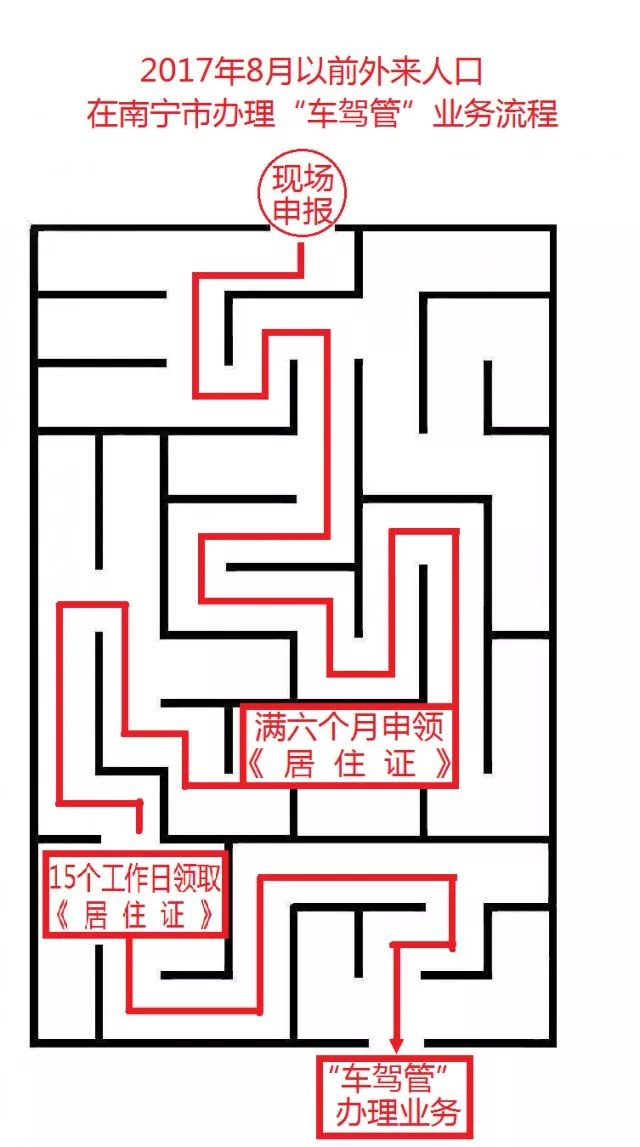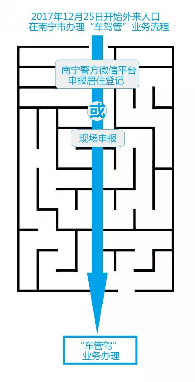 2017 年 8 月开始,南宁市公安局人口管理支队和交警支队联合推出外来人口凭借居住登记证明即可办理 " 车驾管 " 业务,与此同时,南宁公安还推出在官方微信平台 " 南宁警方 " 上申报居住登记的进一步便利措施,流程大为简化为:现场或微信申报居住登记→到派出所领取纸质版的居住登记证明→前往车管窗口办理 " 车驾管 ",节约了当事人 6 个半月的等待时间。