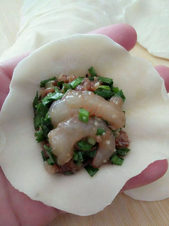 首先韭菜摘好洗干净,放置沥水。肉洗净剁碎,放在容器内加酱油、姜末、葱末、盐适量,煨上,这样做是让肉入味。虾仁洗好,同样的步骤,放置待用。韭菜切末,这时候很关键的一步了,先加花生油,搅拌均匀,然后加提前煨着的虾仁和猪肉,再次搅拌,再根据个人口味加入适量的盐,先加油的目的是让油封住菜,不至于在包的过程中被盐刹下来太多的水。