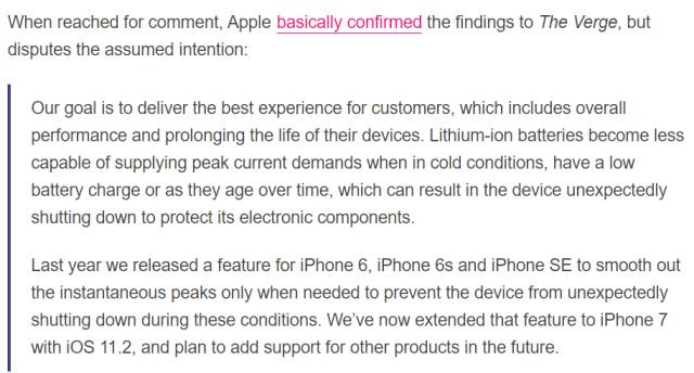 从声明中的内容来看,事实上,苹果去年就已向iPhone 6、iPhone 6s和iPhone SE系列的用户提供了这一功能,使高性能、高耗能需求所导致的瞬时峰值能平稳过渡。而今年已通过iOS 11.2,将功能延伸到了iPhone 7系列,未来也计划将其增加到其他的产品中。