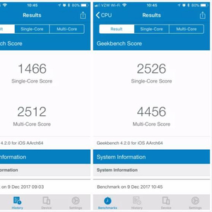 据《卫报》报道,日前,Geekbench开发商Primate Labs创办人普尔在分析许多用户的检测数据后,发现iPhone 6s的性能在iOS 10.2.1更新前后有显著差异,这样的情况在更新11.2系统后更明显,iPhone 7的测试图表,手机性能在更新后也呈现出被调低的特征。