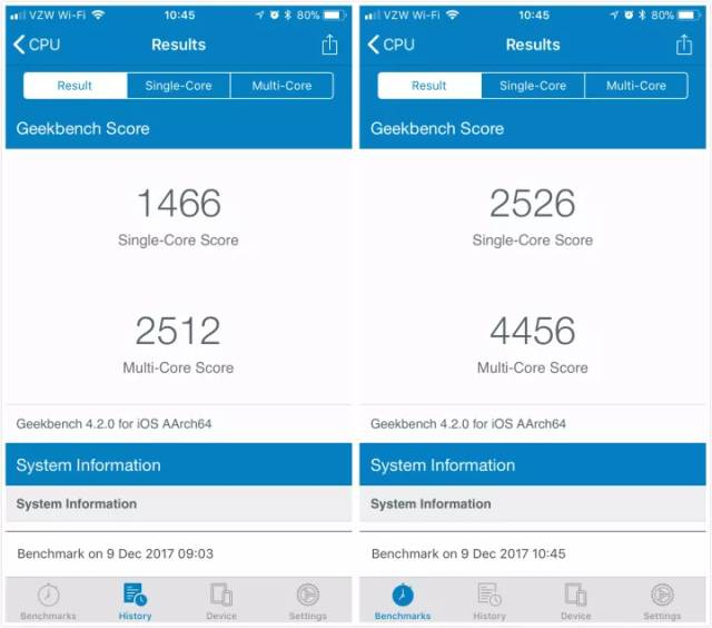 他发现,在更换电池前后,他手中这台旧iPhone 6s的跑分结果出现了较大差异。在他发表上述帖子后,Reddit上大批用户也察觉到这一问题,不少人反映了相同的情况。