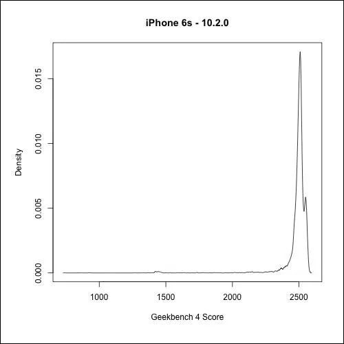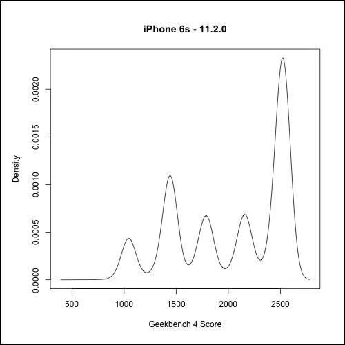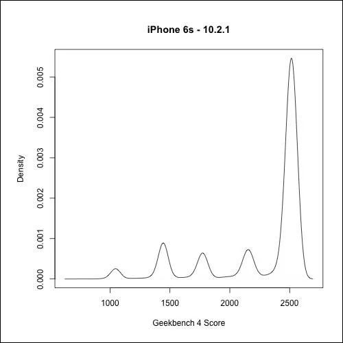 于是,开发GB的实验室创始人之一约翰·普尔(John Poole)整理了公司数千台iPhone的测试数据,并进行了调查。下图是他绘制的iOS10.2.0的iPhone 6s核密度xGB4跑分图,也是一个正常手机性能高峰应该且只应该出现的情况: