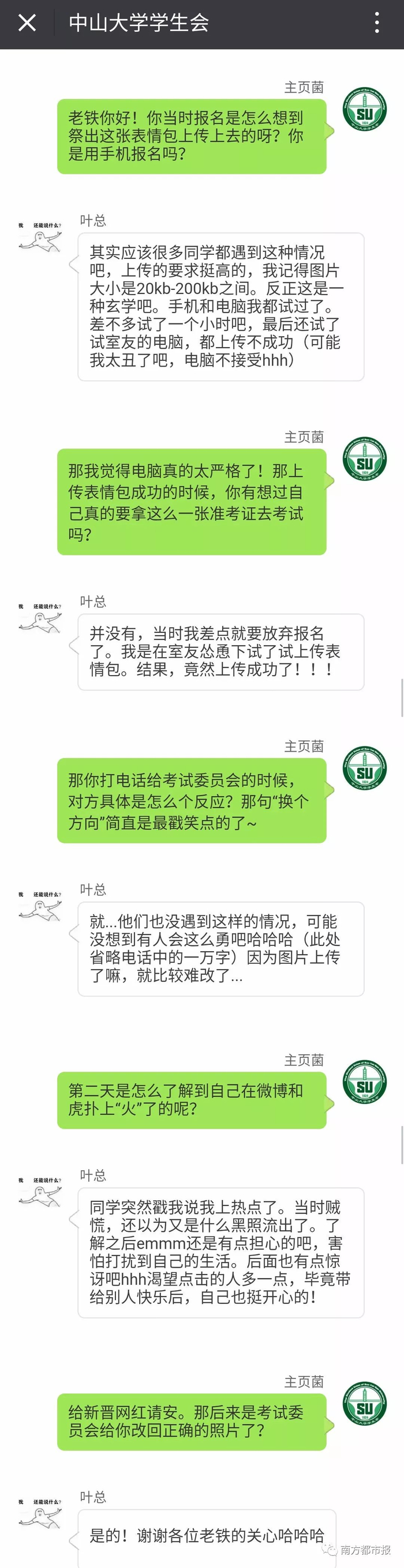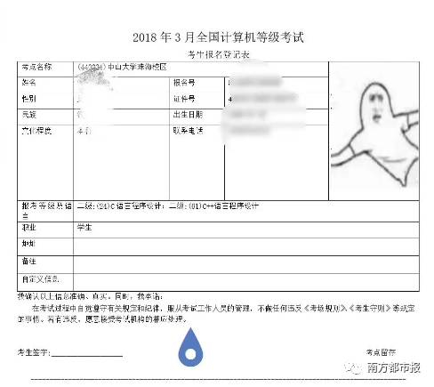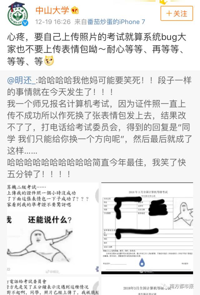 中山大学学生会微信公众号发布消息称,上传表情包的考生为中大学生,姓叶,报考2018年3月全国计算机等级考试,考点为中山大学珠海校区。