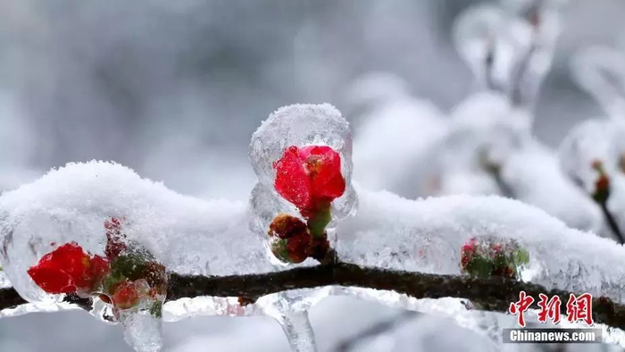 庐山现雨凇雾凇景观 图为冰裹花朵雪压枝。龙晨 摄