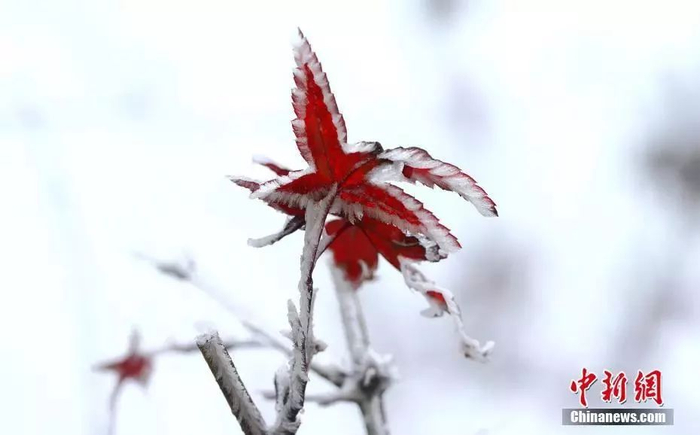 江西庐山现绝美雾凇景观,红枫被雾凇包裹,晶莹剔透。吴健 摄