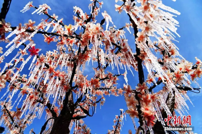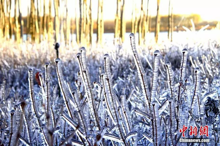 甘肃河西绿洲冰挂千姿百态,林木披上“水晶装”。陈礼 摄