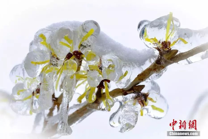 庐山现雨凇雾凇景观,冰冻中的腊梅。 龙晨 摄