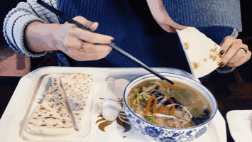 有人这么吃:撕扯着大块面饼浸入羊肉汤中,手拿一瓣糖蒜,待羊汤温度稍降,夹着一块松软的面饼和大片的羊肉尽数塞入口中,不慌不忙的咀嚼中,再来一瓣糖蒜或者萝卜干入口,味道鲜香十足过瘾;