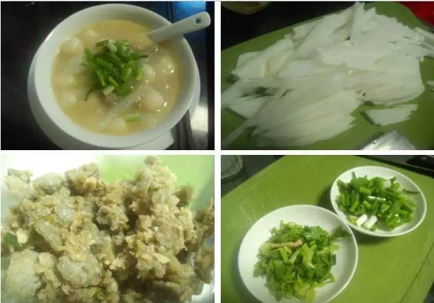 用料以当地海产为主,材料一般配有鱿鱼丝、干瑶柱、虾米干、鲜贝、煎香的鲮鱼肉松、猪杂等等材料来熬出汤底,再加入白萝卜一起熬煮,汤汁鲜甜无比。糯米粉手工做出的圆子口感滑润绵韧,萝卜粒吸收了汤水中的精华更鲜嫩可口。