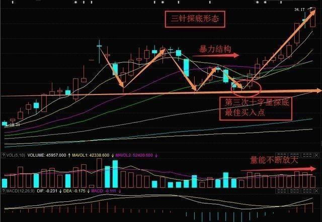 三针探底一般出现在底部和上涨中继调整时,其结构特征为在同一个价位附近,连续出现三次探底十字星而不破最低价格。出现这种走势的个股一般在第三次十字星探底后,出现阳包阴形态时为买入点。如果,三针探底出现在上涨中继中,则其后面的涨幅通常能够翻倍之多。三针探底是比双底更加暴力的底部结构,市场当中不常出现。