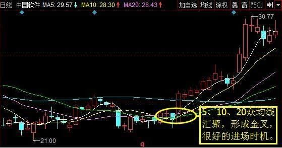 个股经历长期大幅走跌趋势后,反弹拉升时出现缩量回踩走势,此时MA5、MA10以及MA20出现三线汇聚,形成金叉,出现再次上攻的迹象,那么就是最好的建仓机会。