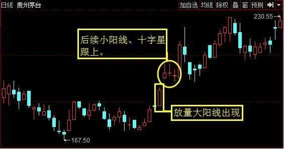 2、一根大阳线之后出现三个以上小阳线或十字星