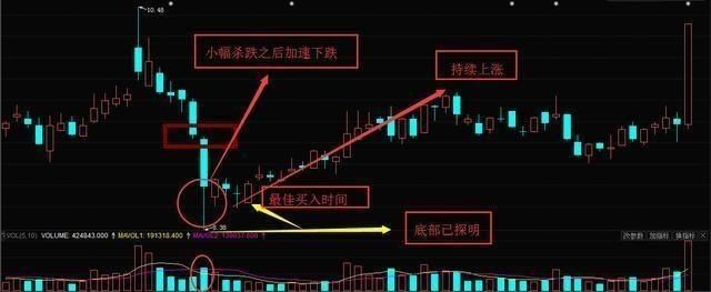 当某只个股经过一段时间的小幅阴跌后,突然出现加速下跌,并在某一天收出一根跳空向下且带有下影线的阴线,并伴随成交量明显放大,即说明阶段性底部已经出现,后市看涨。如下图: