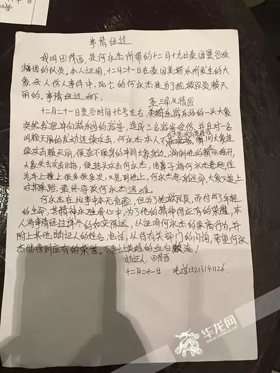 田茂西称自己为涉事旅行团团员,曼谷时间12月21下午17时左右,他与七八位游客以及领队何永杰在象园停车场内聊天,突然两名游客(非本团游客)所骑的大象突然“发疯”,冲向该旅行团一名叫赖天丽的团员并发起攻击。何永杰见状立即上前拖住赖,并将其拖到安全区域。大象失去攻击目标后转而进攻何永杰,并用鼻子将其摔到附近的车上,何永杰起身逃离未果,大象追上他进行踩踏,导致何永杰遇难。田茂西在信中还特意指出,发生事故时驯象师仍在象背上。同时此份书面材料后还附有多名游客的签名。