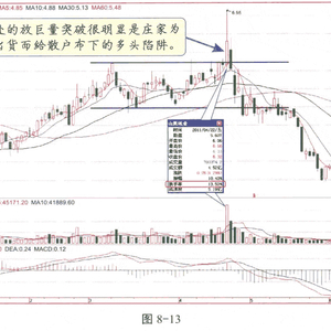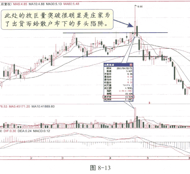 巨量是指超过10%的换手率,在投资者心里,盘整后放巨量突破通常是买入时机,但如果是高位盘整放巨量突破,那么通常是假突破。因为在高位,庄家已获利丰厚且控盘,而突破放巨量很显然是跟风盘吃货及庄家派货共同造成的。既然庄家都派货了,广大投资者如果再跳进庄家设置的美丽陷阱里,将会损失惨重,如图8-13所示。