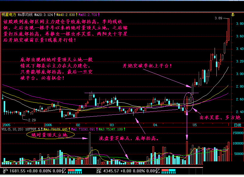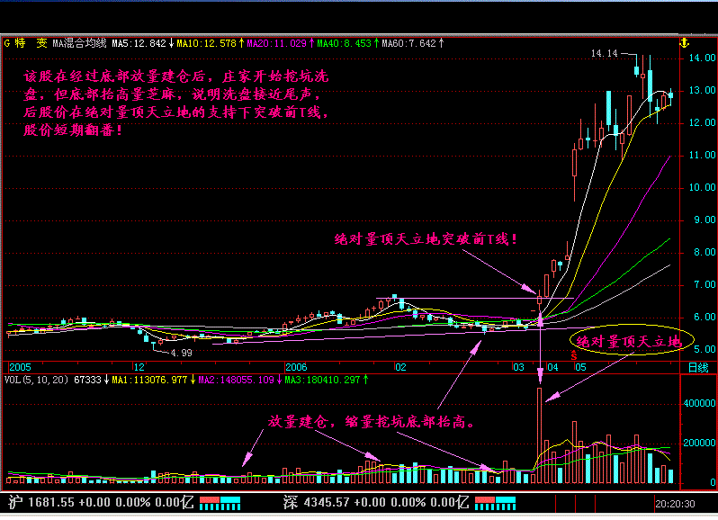 而对于出现在建仓末期经过洗盘量芝麻点后的再次启动行情时的绝对量顶天立地,那就是庄家启动行情的标志了。这点是要留意的,所以对于底部建仓初期出现的绝对量顶天立地不要忙于追涨,而可以找量芝麻低点逢低适量吸纳,而对于建仓基本完毕后的突破性绝对量顶天立地则要追进,否则有踏空的可能!