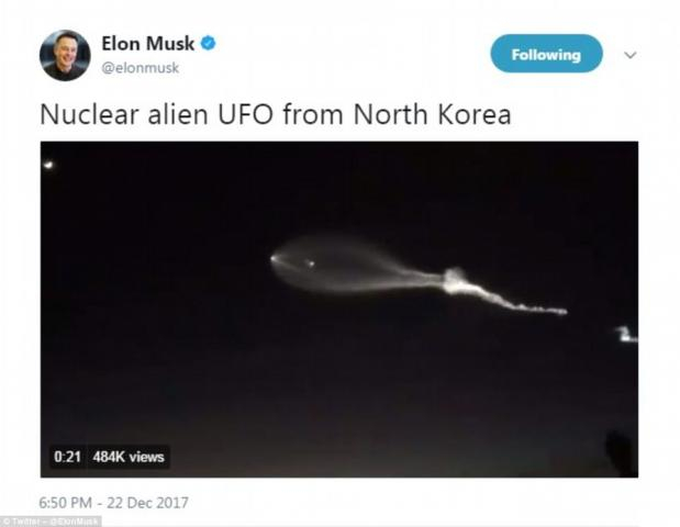 美国太空探索技术公司(SpaceX)老板马斯克也在社交媒体推特上发图称:"来自朝鲜的核动力外星飞船。"不过,马斯克这明显是在开玩笑。因为,这个神秘物体其实就来自于他的公司。