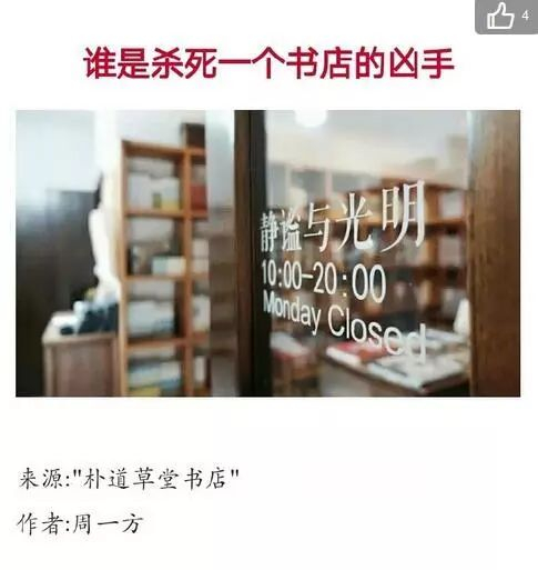 4月22日,一篇名为《谁是杀死一个书店的凶手》的文章在朋友圈热传,店家以感性文笔述说书店的重要和经营不易,并称被政府告知,书店门口要求封闭,原因是影响市容。文章也迅速成了10w+热点,一波波围观群众纷纷在留言里站队书店,谴责城管的暴力行径。