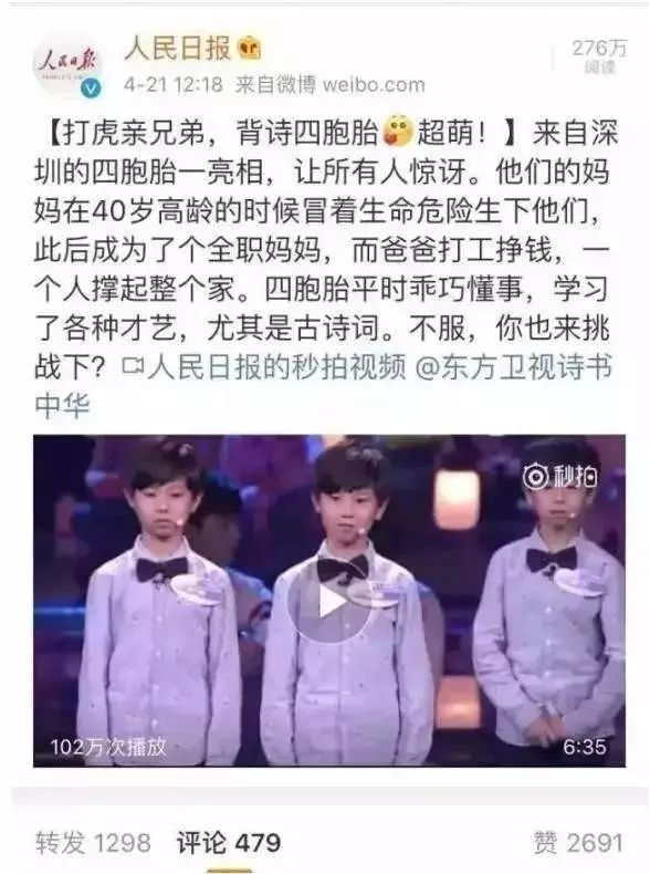 4月下旬,人民日报一条称赞四胞胎男孩“懂事有才”的微博引发网友关注。之前也有不少媒体给了四胞胎出头露脸的机会,这四个小男孩和他们的故事感动了无数电视和网络观众,同时给他们父母带来了可观的收益。