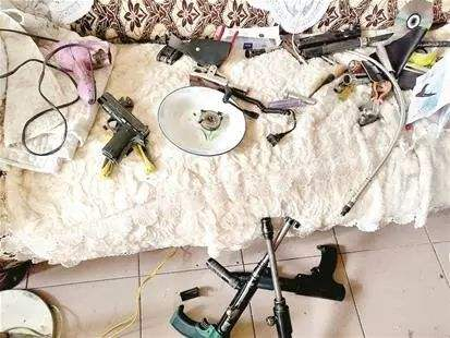 同一时刻,守候在来凤的民警将刘某私宅团团包围。只见这栋三层小楼的拐角处密布探头,而实时视频就显示在刘某的手机上。冲入刘某家中,沙发上放着5支自制手枪、自动步枪,子弹百余发,一个房间里还有车床用于加工武器,上面摆满了制枪零件。