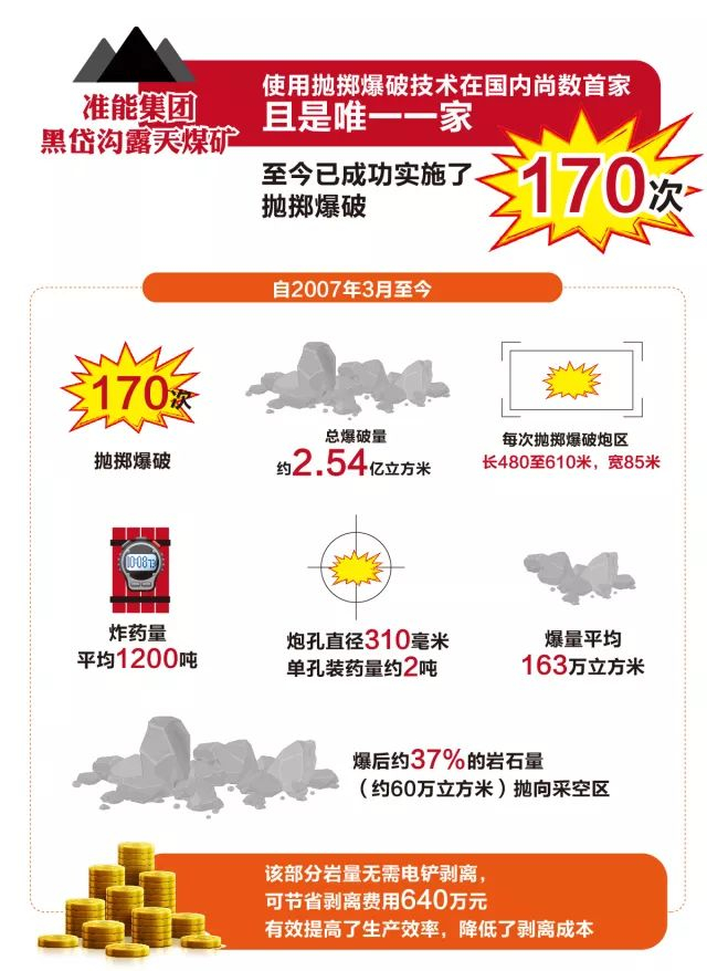 准能集团黑岱沟露天煤矿使用抛掷爆破技术在国内尚数首家,且是唯一一家,至今已成功实施了170次抛掷爆破,其相关技术经验在国内首屈一指,填补了国内抛掷爆破技术空白。
