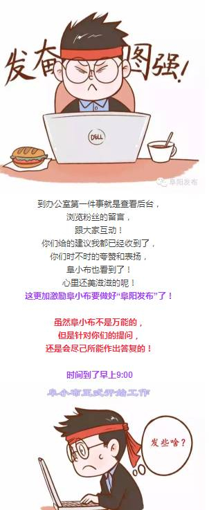 “阜阳发布”成绩的取得,既得益于党委政府的大力支持,主管领导的重视,当然离不开的是新媒体编辑们的勤奋。阜阳发布的编辑人员平常被网友亲切称为“阜小布”,全年365天通过阜阳发布各个平台,用心讲好阜阳故事,让阜阳的好声音传的更远,也让阜阳的形象越来越好。