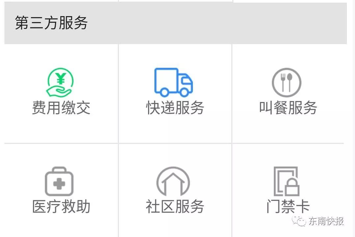 第三方服务板块有费用缴交、快递服务、叫餐服务、医疗救助、社区服务、门禁卡等功能。