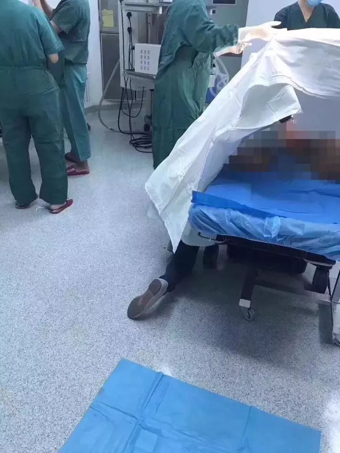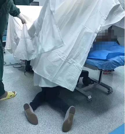 9月25日深夜,从产妇突发破水入院,到胎儿脱离危险、呱呱坠地,这名祈福医院的女医生一直在手术床下双膝跪地以一种特别别扭、难受的姿势托举着产妇腹中的胎儿。