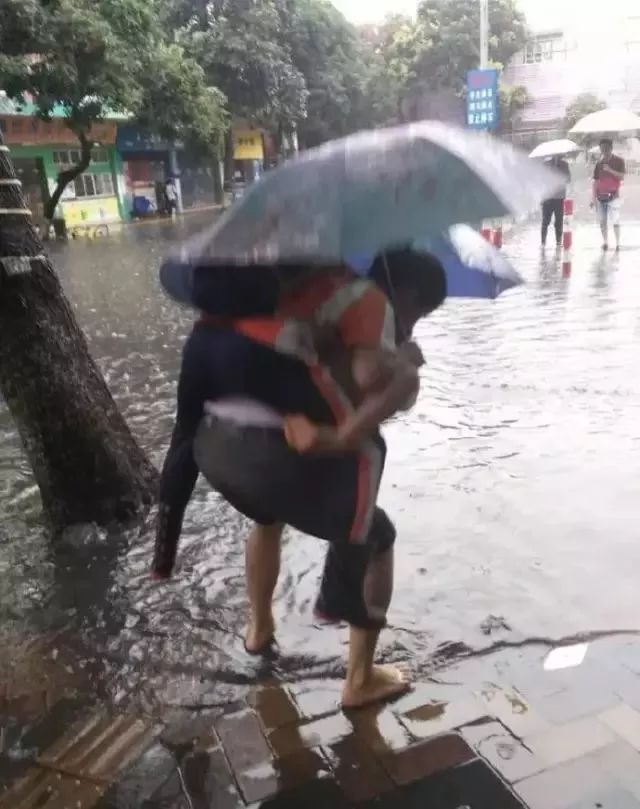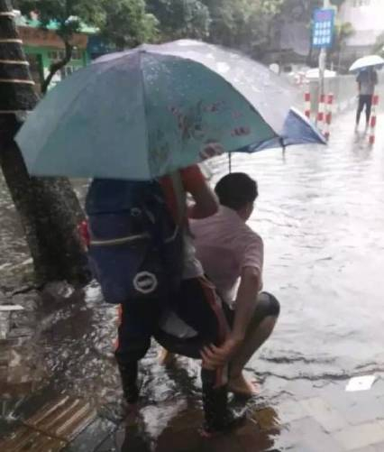 5月24日,在番禺区洛溪新城小学门口,为了让孩子们能够不湿脚,校长钟世贵光脚背小朋友进学校。这一幕被家长捕捉到并发到了朋友圈赢得了一片赞声。