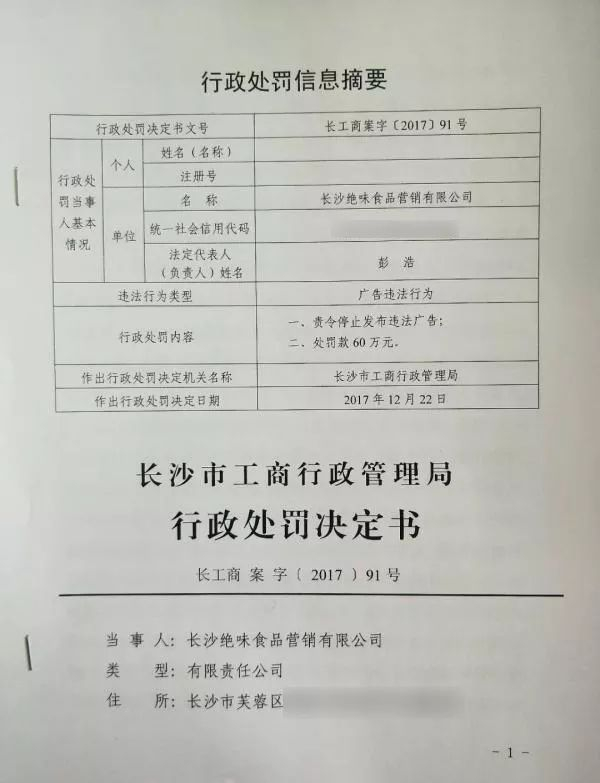 22日,绝味食品发布公告称,此前子公司发布的网络广告内容违反广告法,长沙市工商行政管理局责令(绝味食品子公司)停止发布违法广告,罚款人民币60万元整。